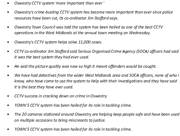 A 2014 report from The Shropshire Star said:Oswestry has seen its new CCTV system launched – with it being hailed as the best in Shropshire.