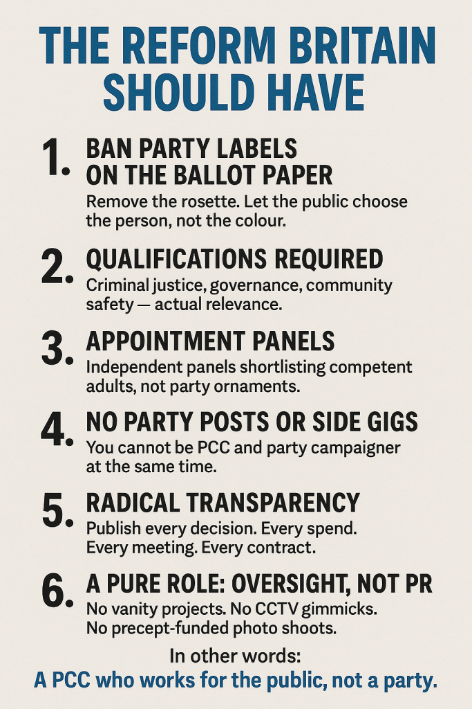 There comes a moment in every great British farce when you realise the people in charge are no longer even pretending to steer the ship — they’re simply rearranging the deckchairs and congratulating each other on their boldness. That moment arrived the second Westminster announced its latest stroke of governance genius: abolish the one elected official we can actually identify. Not fix them. Not improve them. Not depoliticise them. No — just tip the whole structure into the recycling bin and hand policing oversight to a committee who can’t even agree on how to fix a streetlight, let alone a police force.