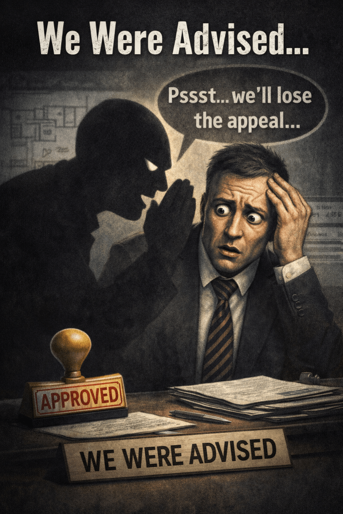Once this mindset takes hold, the planning authority stops deciding and starts anticipating defeat. Developers learn the trick. Threaten appeal. Watch the spine soften.