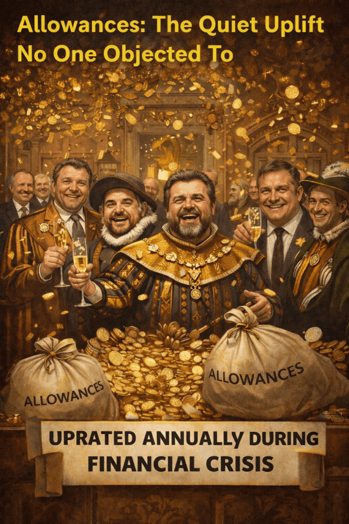 These increases were not presented as pay rises. They were described as “uprating”, applied through multipliers embedded within the Members’ Allowances Scheme and reported as technical adjustments rather than political choices.