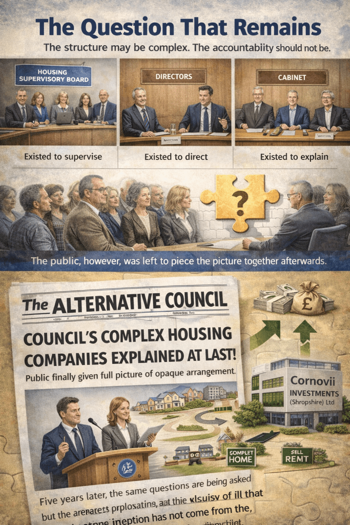 The purpose of the Board was to ensure that Cornovii delivered what it had been created to deliver. If expectations changed, when were councillors informed? If risks increased, who challenged the strategy? And if the business model evolved, why did public understanding lag behind internal knowledge?