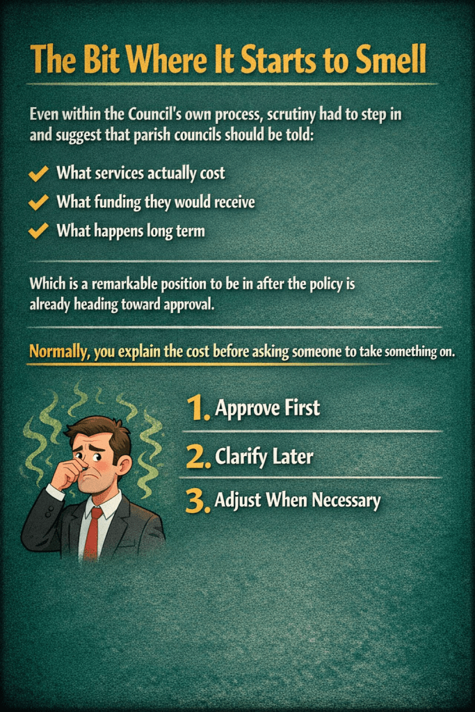 Even within the Council’s own process, scrutiny had to step in and suggest that parish councils should be told: