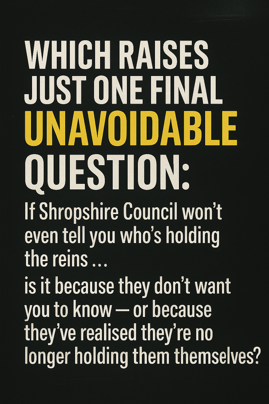 It Didn’t Fail. It Worked — Just Not for You Shropshire Council was sold as progress in 2009 One council.One vision.One streamlined authority delivering better services for less money. What we got instead was something far more efficient: a system that concentrates power, disperses blame, and exports failure. Let’s stop pretending this is a glitchContinue reading “Abolish Shropshire Council”